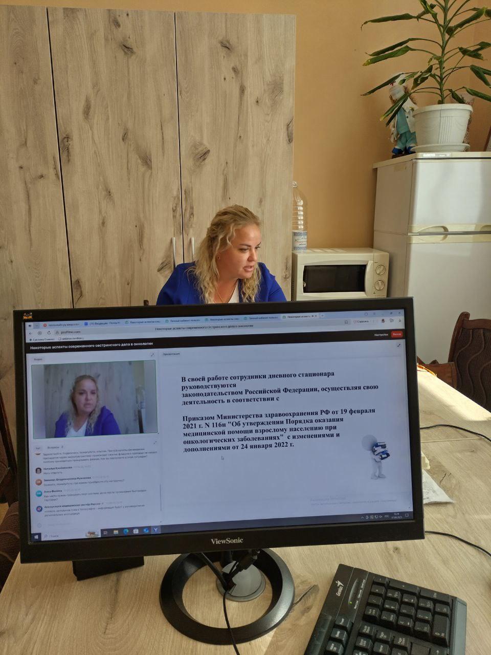 Так же активное участие в семинаре приняли и наши коллеги. Об организации работы отделения дневного пребывания для пациентов, получающих химиотерапевтические препараты, рассказала старшая медицинская сестра химиотерапевтического отделения Nº2 ГБУЗ «Тамбовский областной онкологический клинический диспансер» Прохорова Н.А.