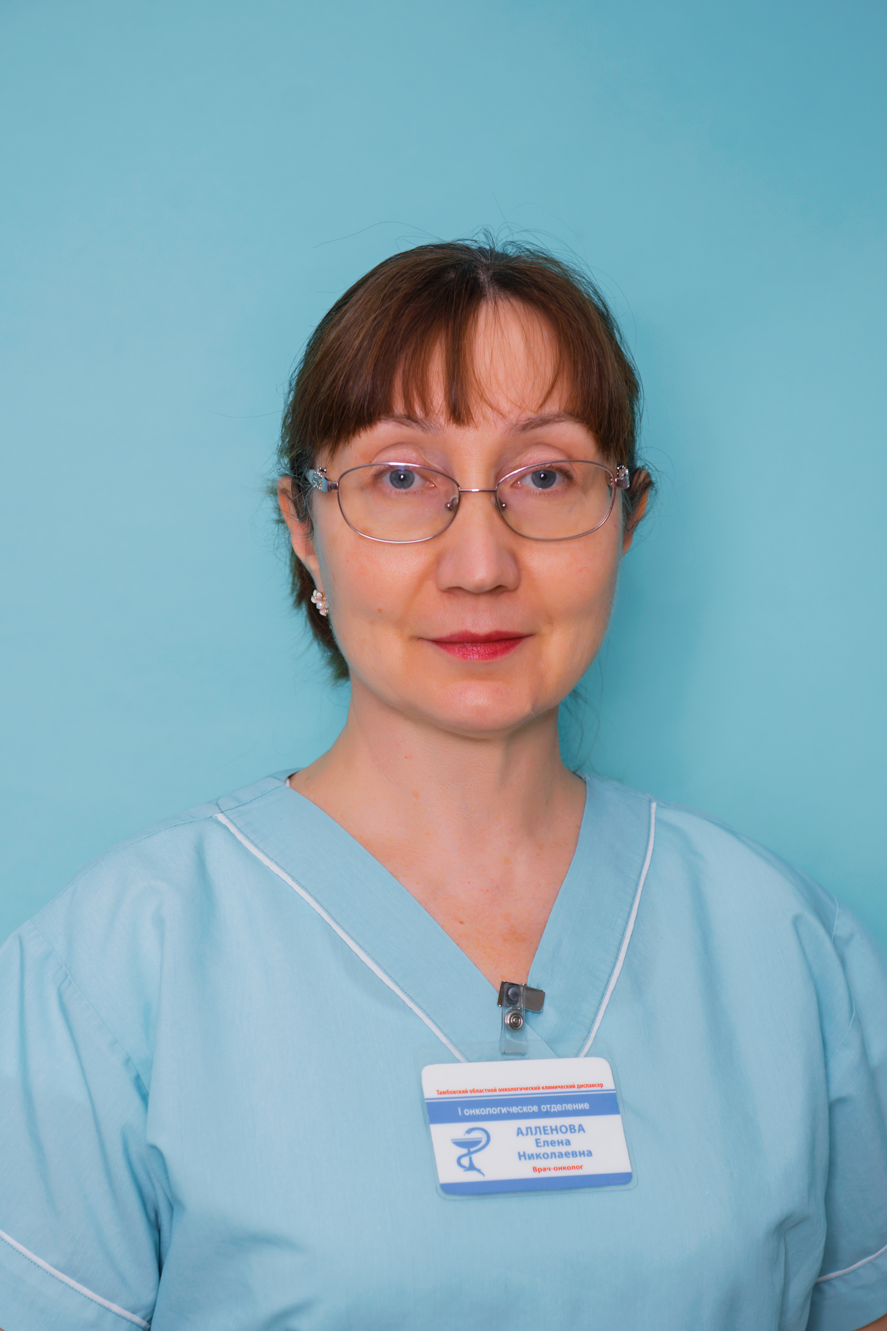 Алленова Елена Николаевна Рязанский государственный медиц.инский университет 1999 г.- лечебное дело Интернатура по онкологии 2000 год Сертификат «Онкология» 26.11.2020 года Категория «Онкология» - высшая 2022 год |