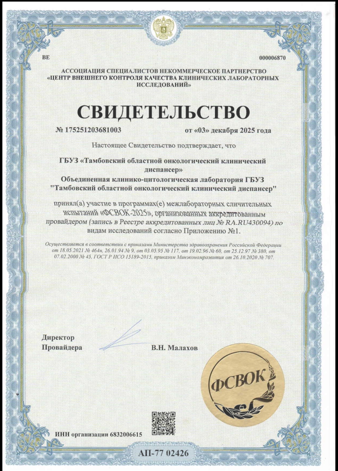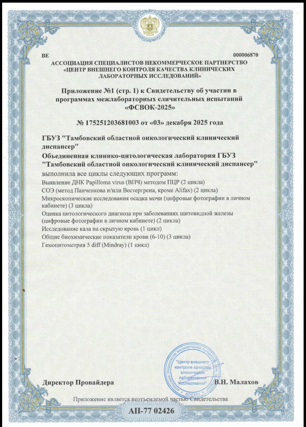 Объединённая клинико‑цитологическая лаборатория ГБУЗ «Тамбовский областной онкологический клинический диспансер» с гордостью сообщает о результатах участия в Федеральной Системе Внешней Оценки Качества (ФСВОК) в 2025году.