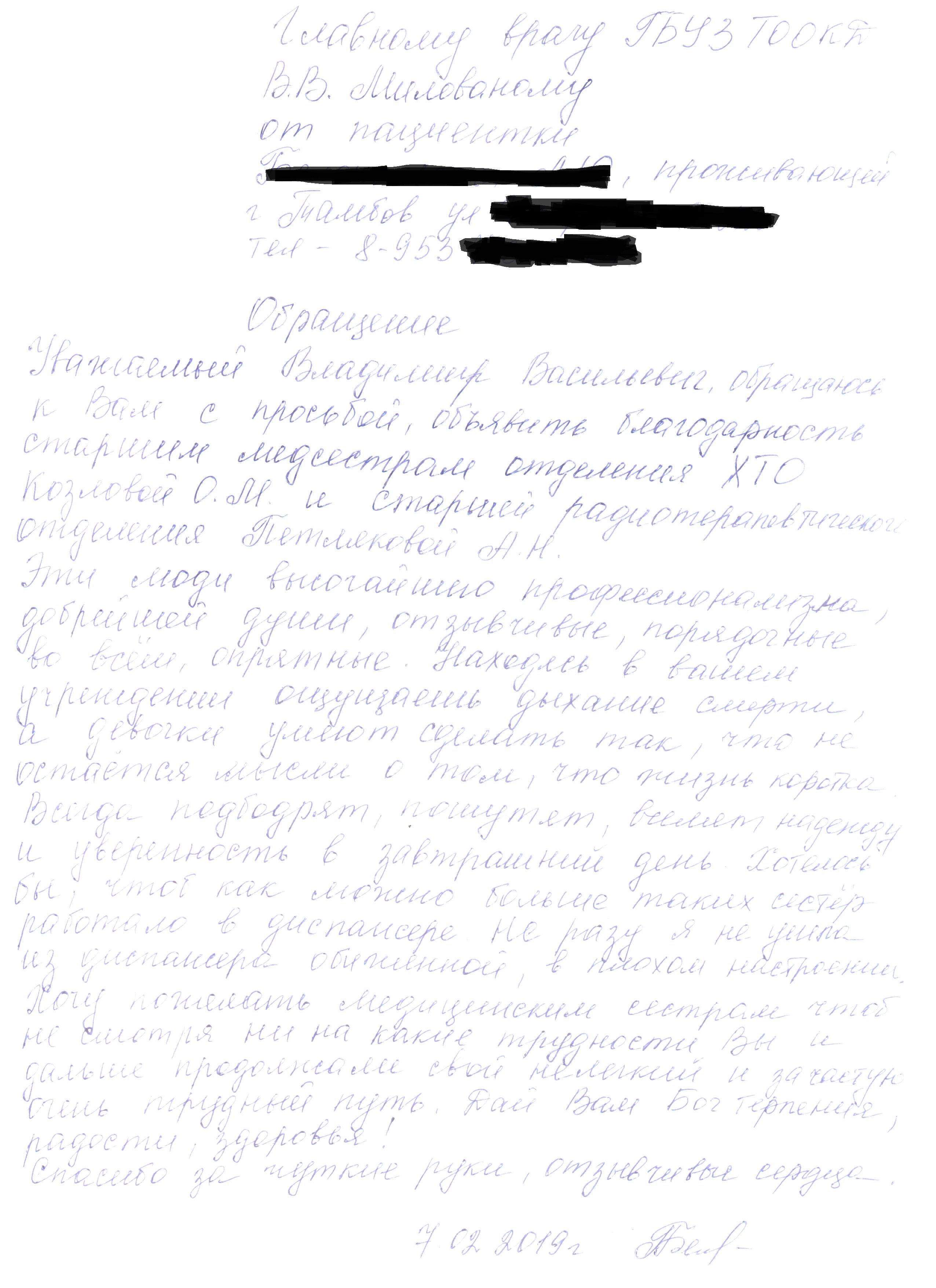Благодарность глав врачу Владимиру Васильевичу Милованову